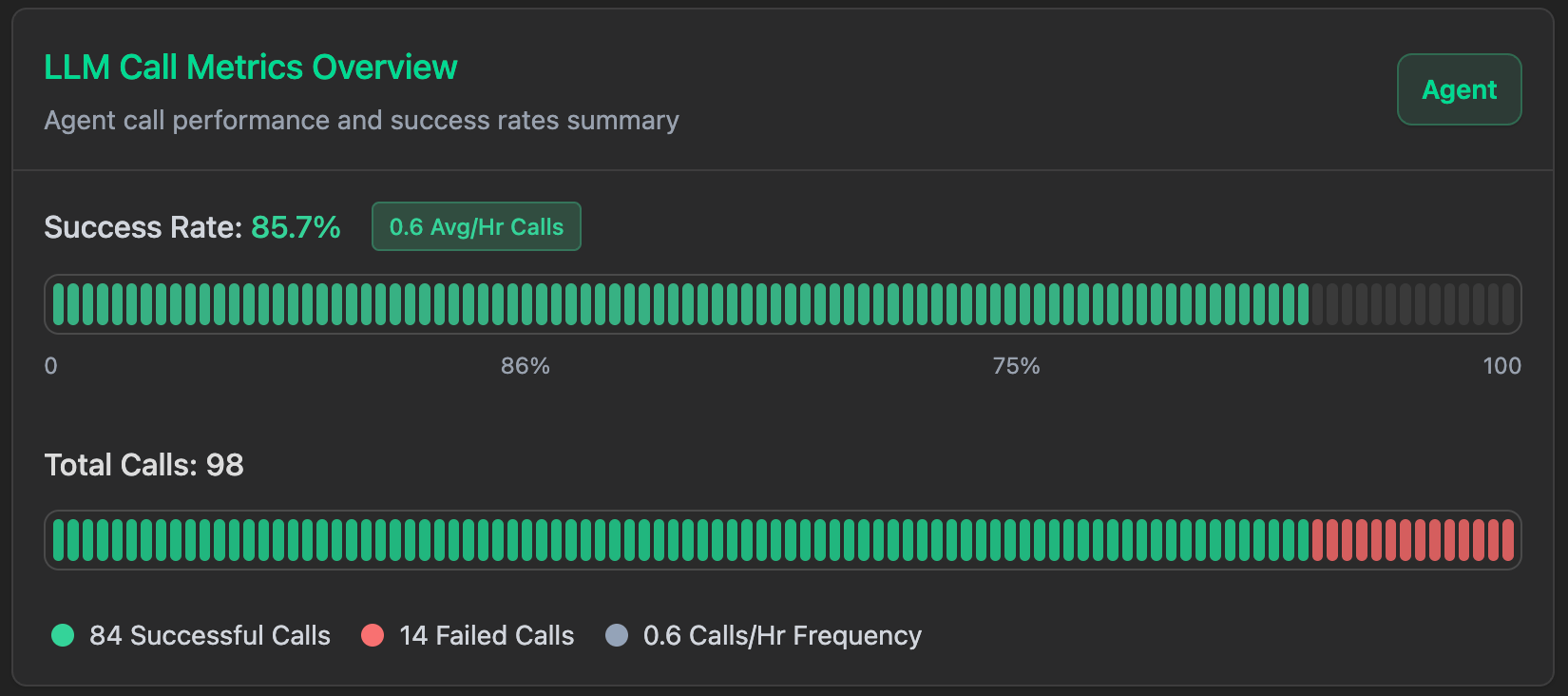 - Success Rate: Shows how many LLM calls were completed successfully (e.g., 100.0% in the example)